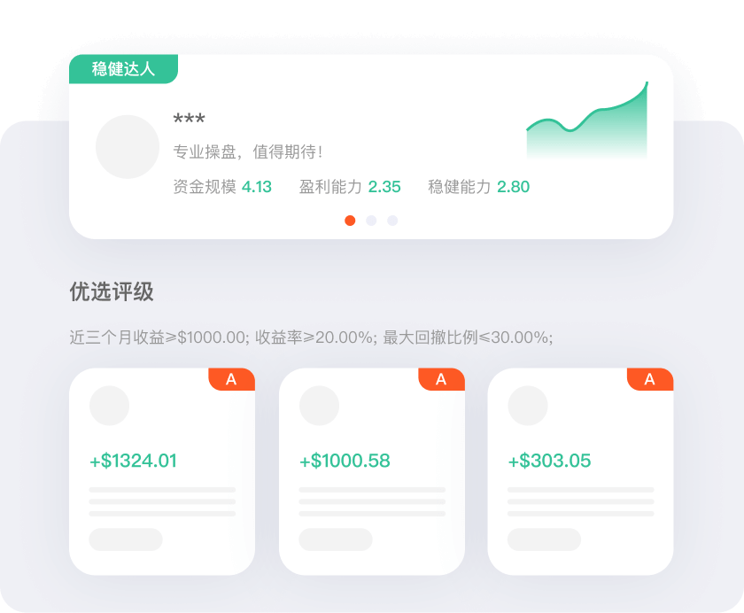 将优秀的交易信号置顶轮播,也可根据不同的指标,筛选不同类型的交易信号,推荐给不同目标和风险偏好的跟随者。