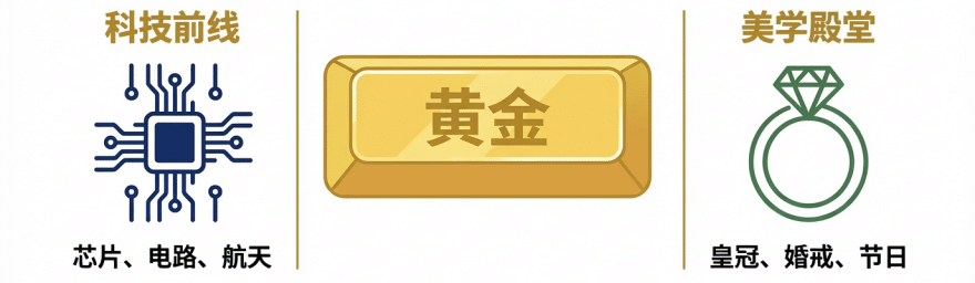 - 科技前线:你手机里的芯片、电脑主板上的“金手指”、甚至宇航员的面罩镀层,都含有黄金。因为它导电性顶级、永不生锈,是精密电子和航空航天领域无可争议的“王牌材料”。