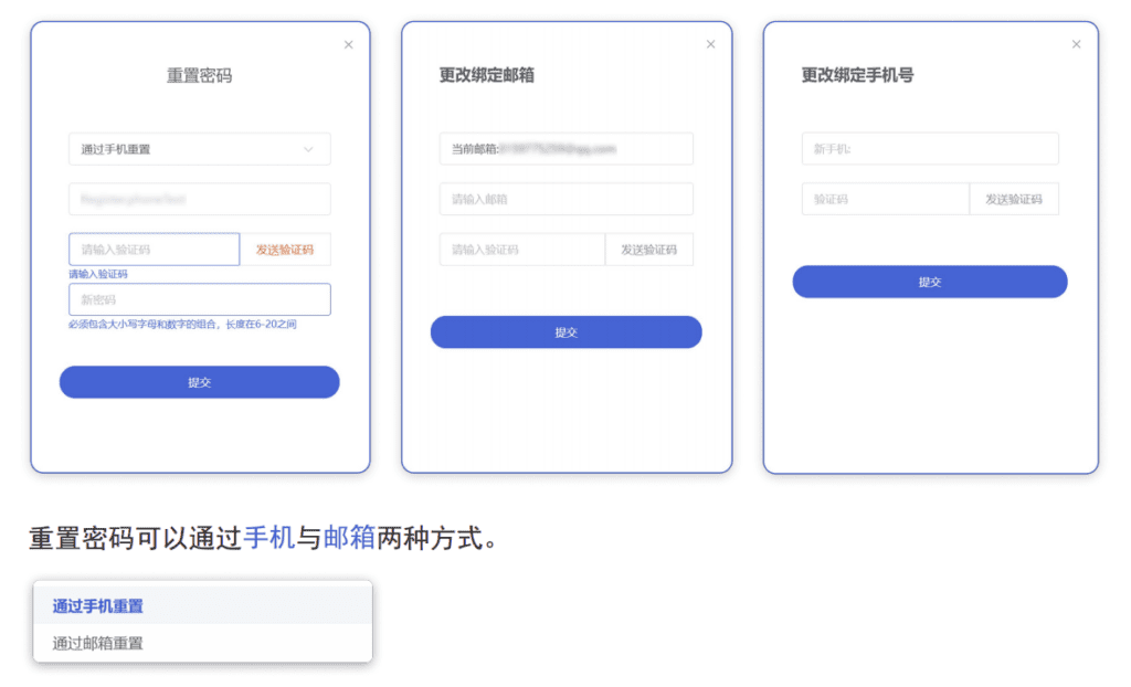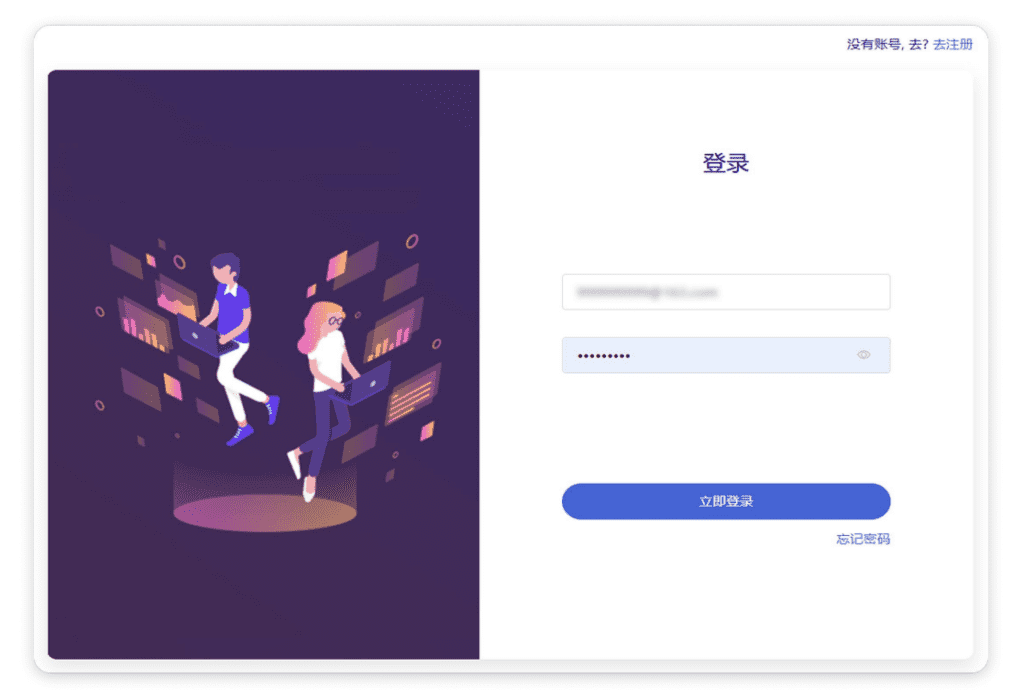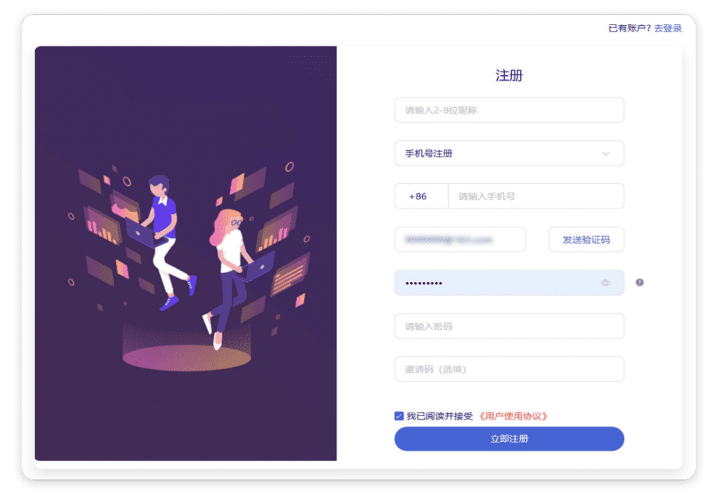 当点击注册按钮时,跳转此注册页面。此时可注册账户,或是点击右上角去登陆切换至登录页面。如果手机验证码无法收到,可以点击手机号注册下拉框切换为邮箱注册,通过接收邮箱验证码完成帐号的注册。