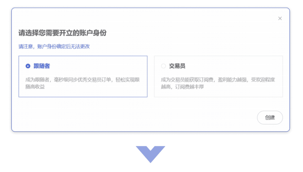 用户需先选择账户身份,创建的账户将会绑定选择的身份,点击创建按钮将跳转至账户注册网址。