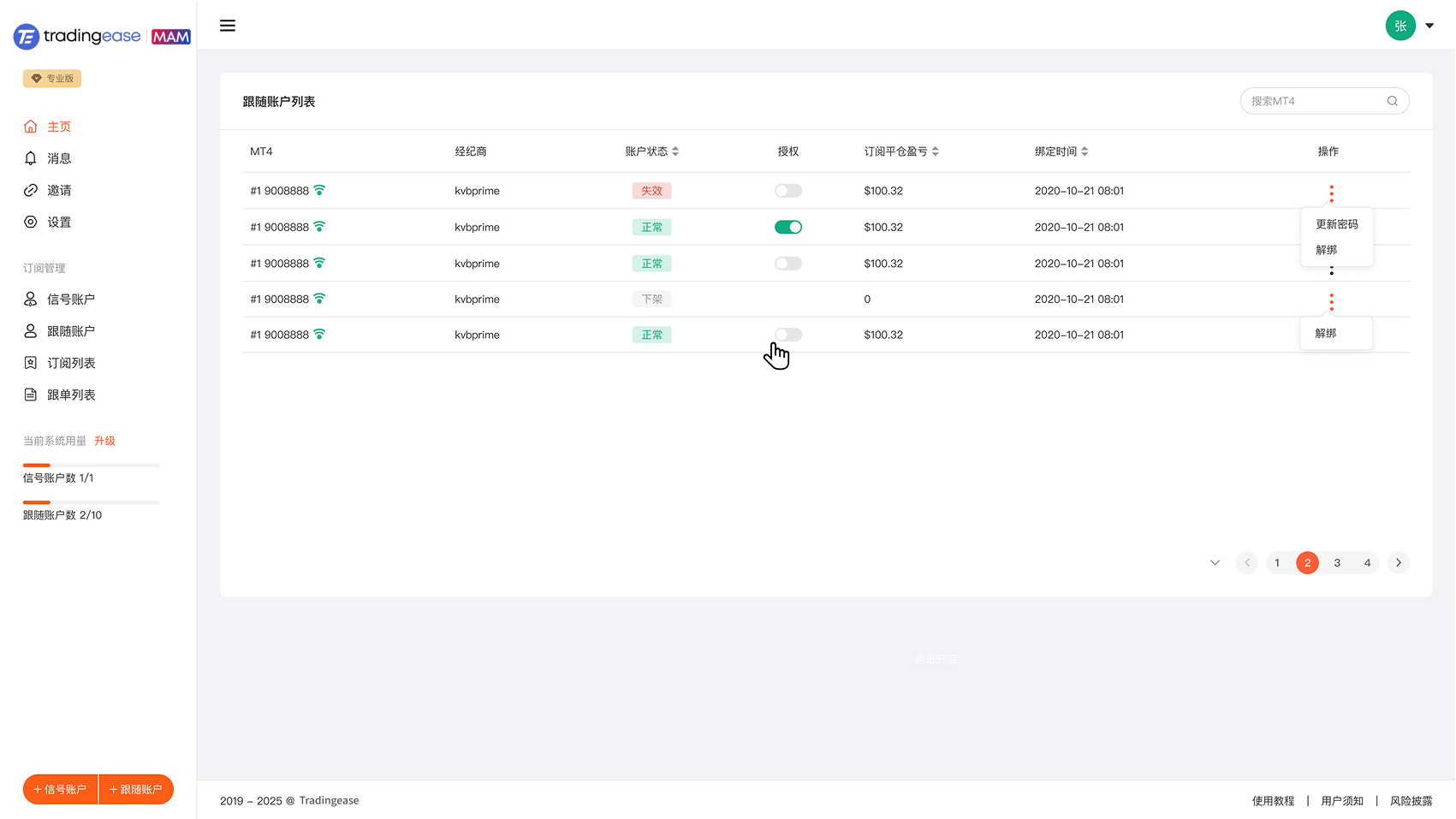 支持多平台账户管理,无需 VPS,在线绑定交易账户,轻松批量管理多个账户,提升操作效率。