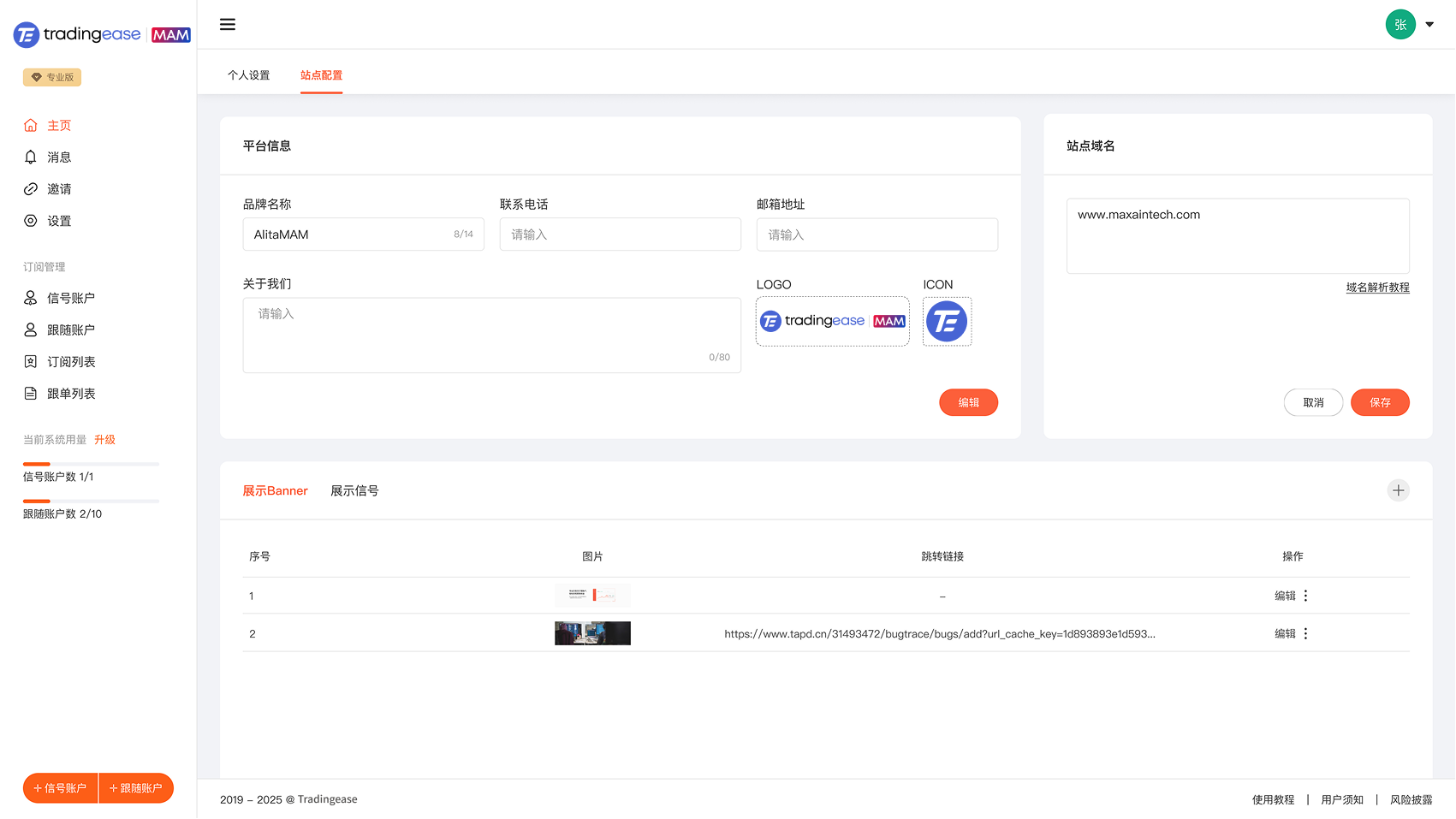 支持个性化首页、独立域名和 Logo,帮助操盘手快速建立专属品牌,提升市场竞争力。