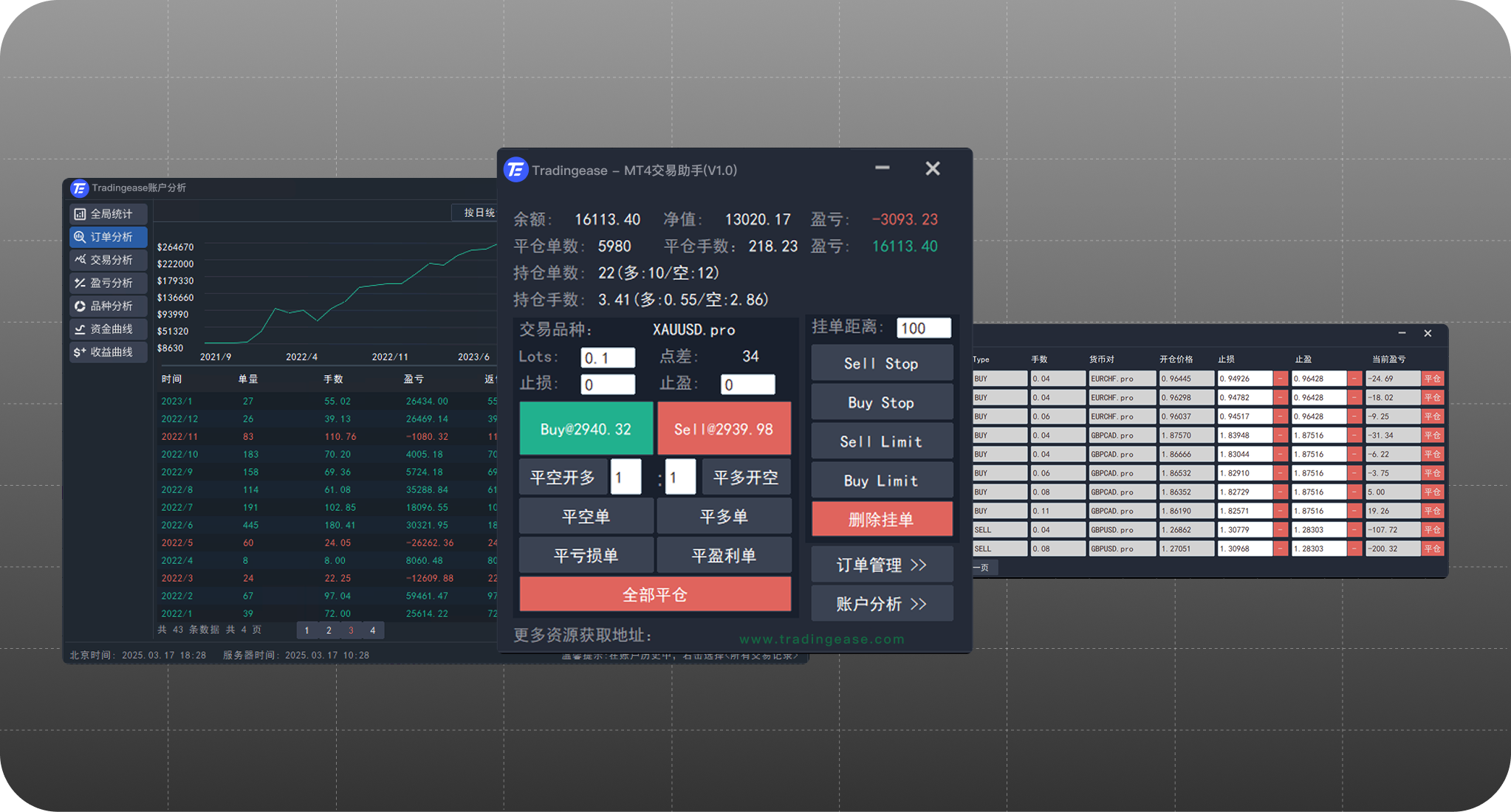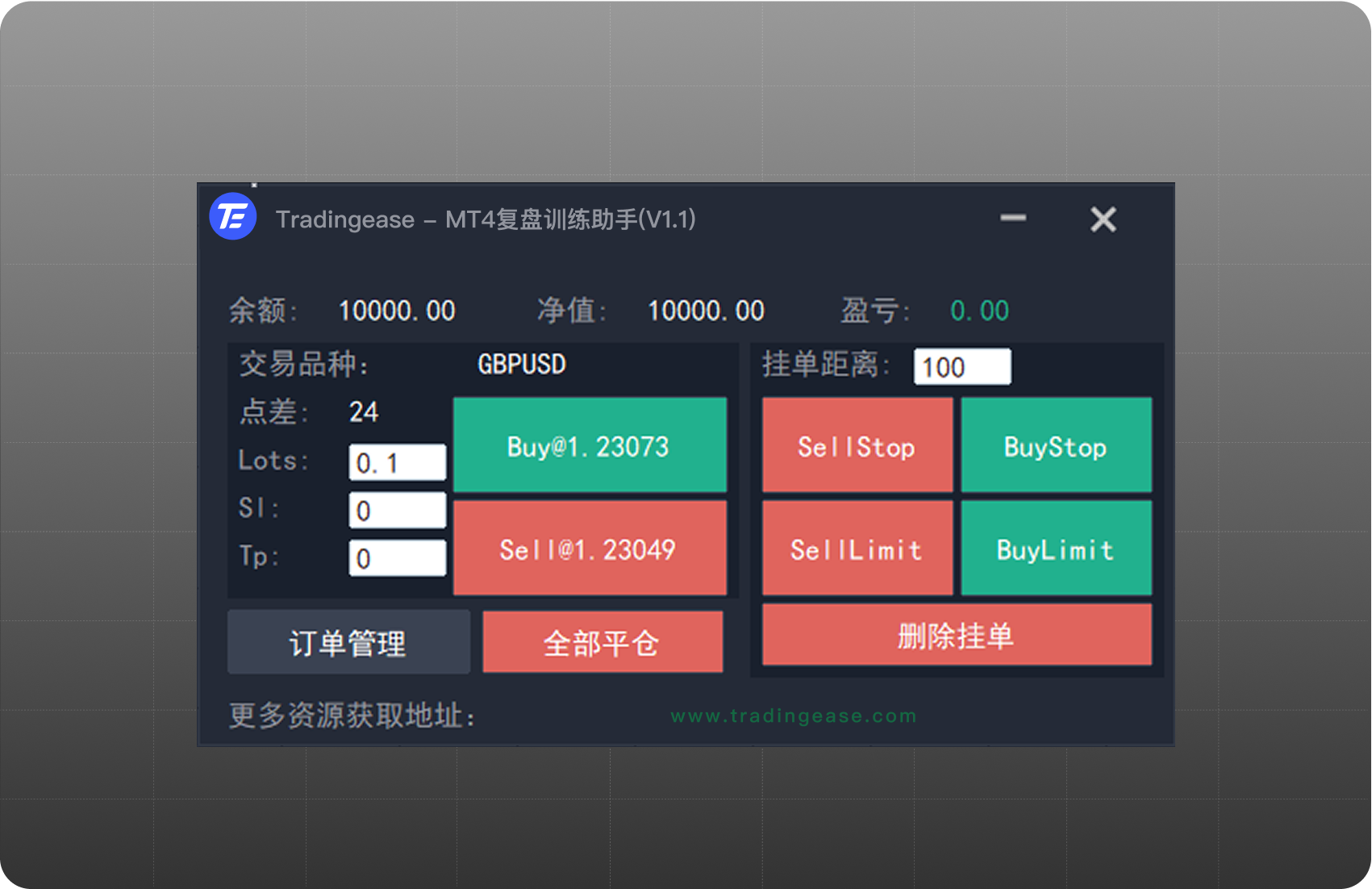 这是一款MT4多功能交易工具,有一键平仓、挂单管理、止盈止损设置及批量订单管理功能,让用户高效管仓、优化风控、提升交易效率 。