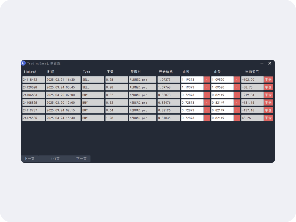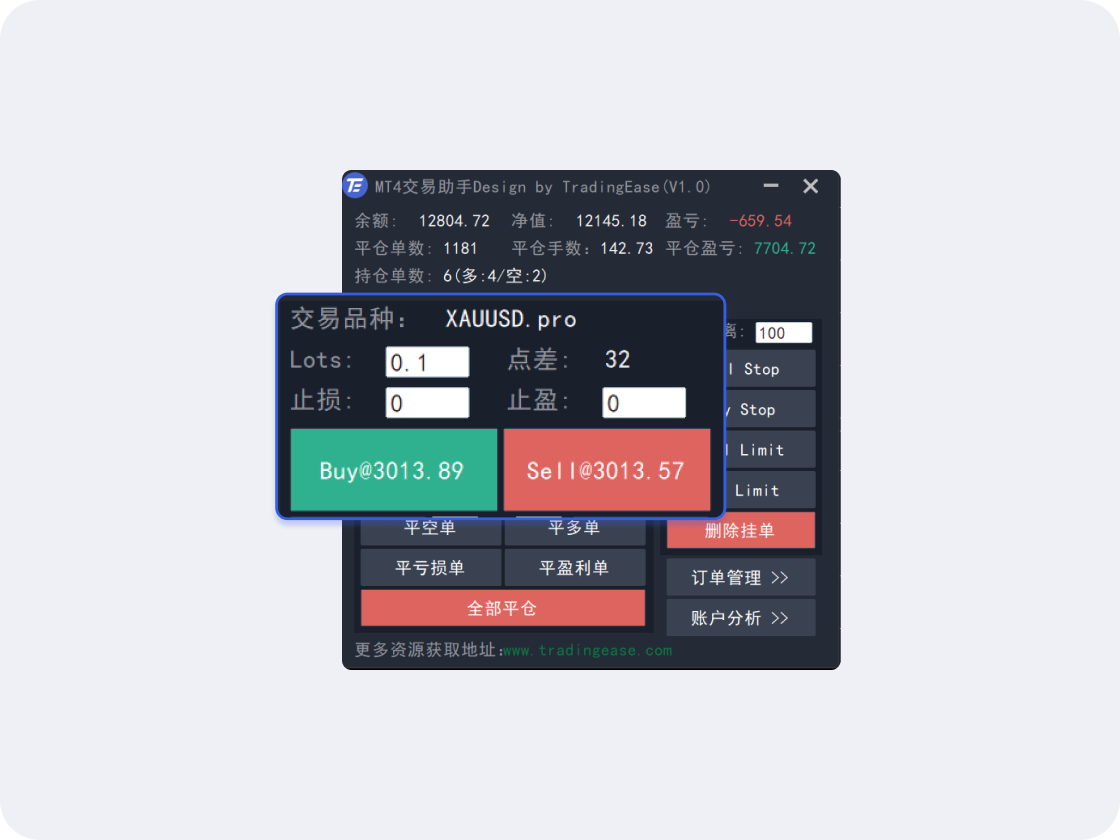 MT4交易助手是Tradingease 专为MT4打造,以独特界面、丰富交易逻辑与完善统计分析,为新老交易员提供便捷高效体验,借个性化设置、精准风控与高效操作助力交易 。