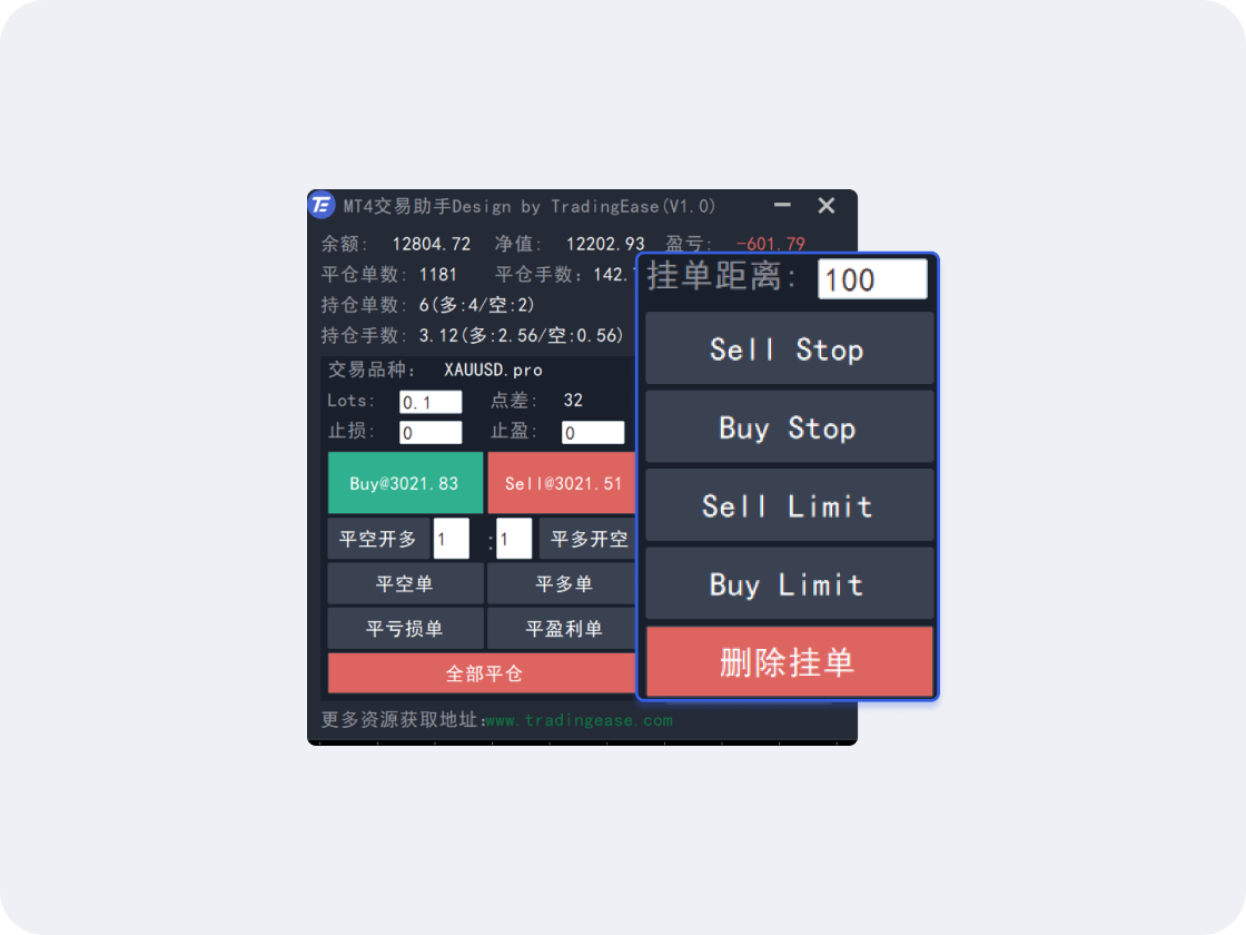 支持MT4全挂单,自定义挂单距(免换算)、手数、止盈损,按需设魔术号与注释。