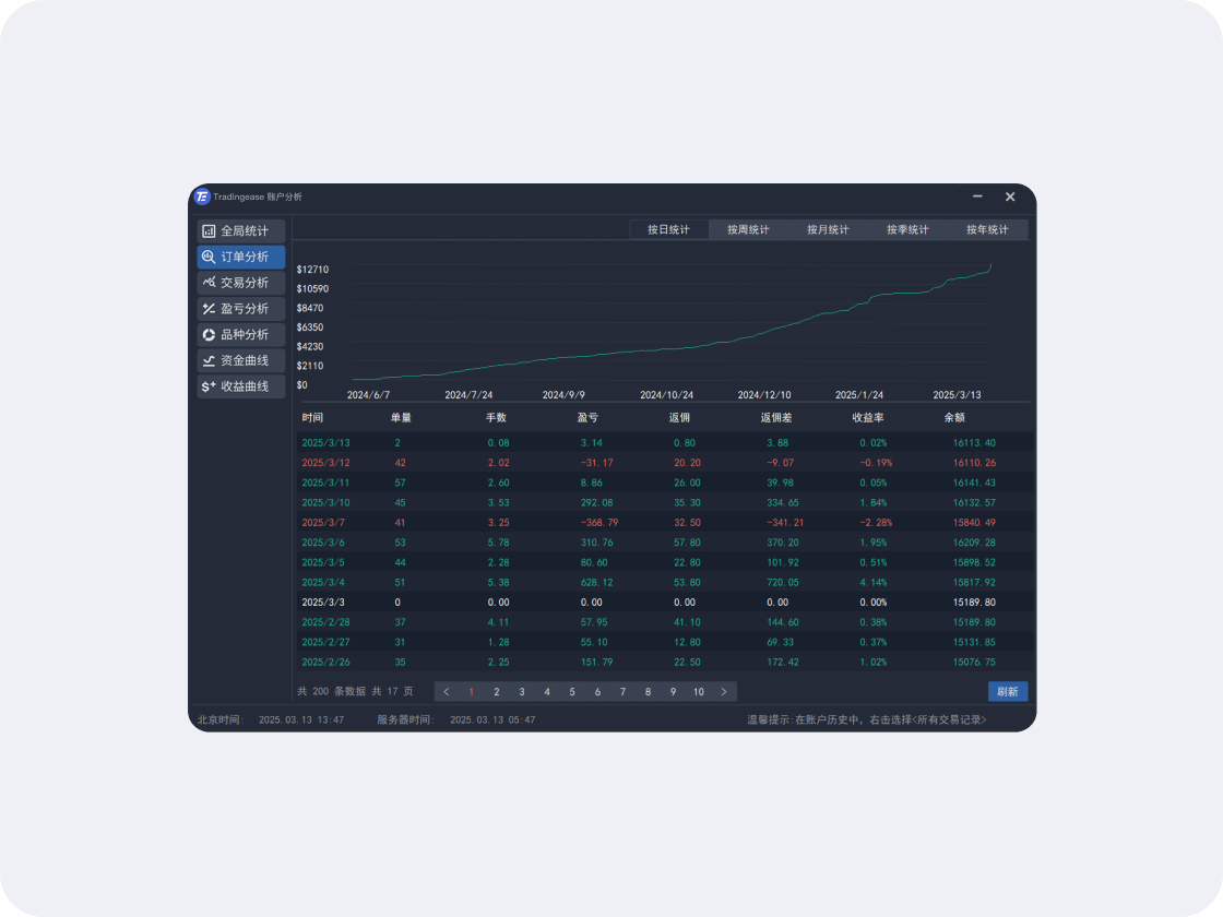 提供多维度账户分析,包括持仓分析、订单分析、盈亏分析,收益曲线、资金曲线、品种分析等,通过图表直观的体现出来。