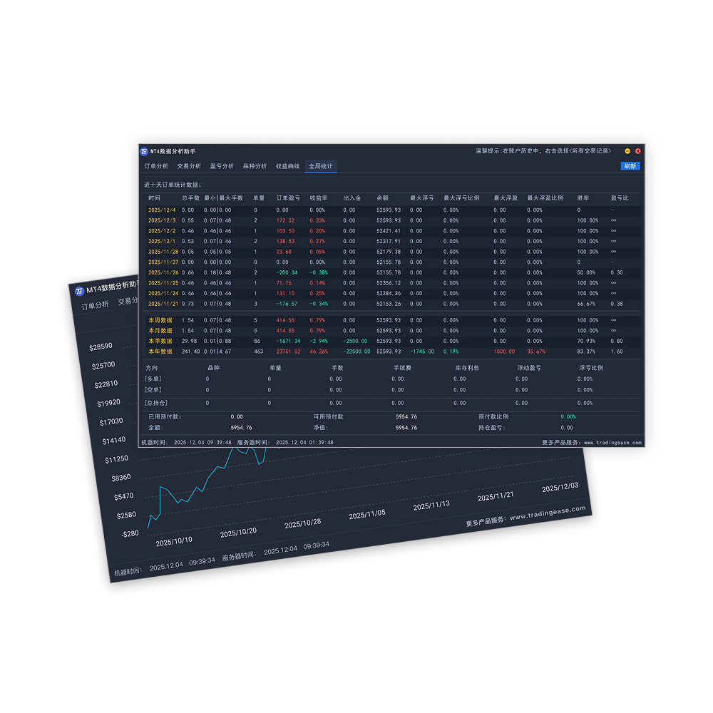 - 多维度绩效分析引擎:整合订单、交易、品种三大分析模块,从手数、单量、盈亏比、胜率、最大回撤等超过14个关键指标进行交叉评估。