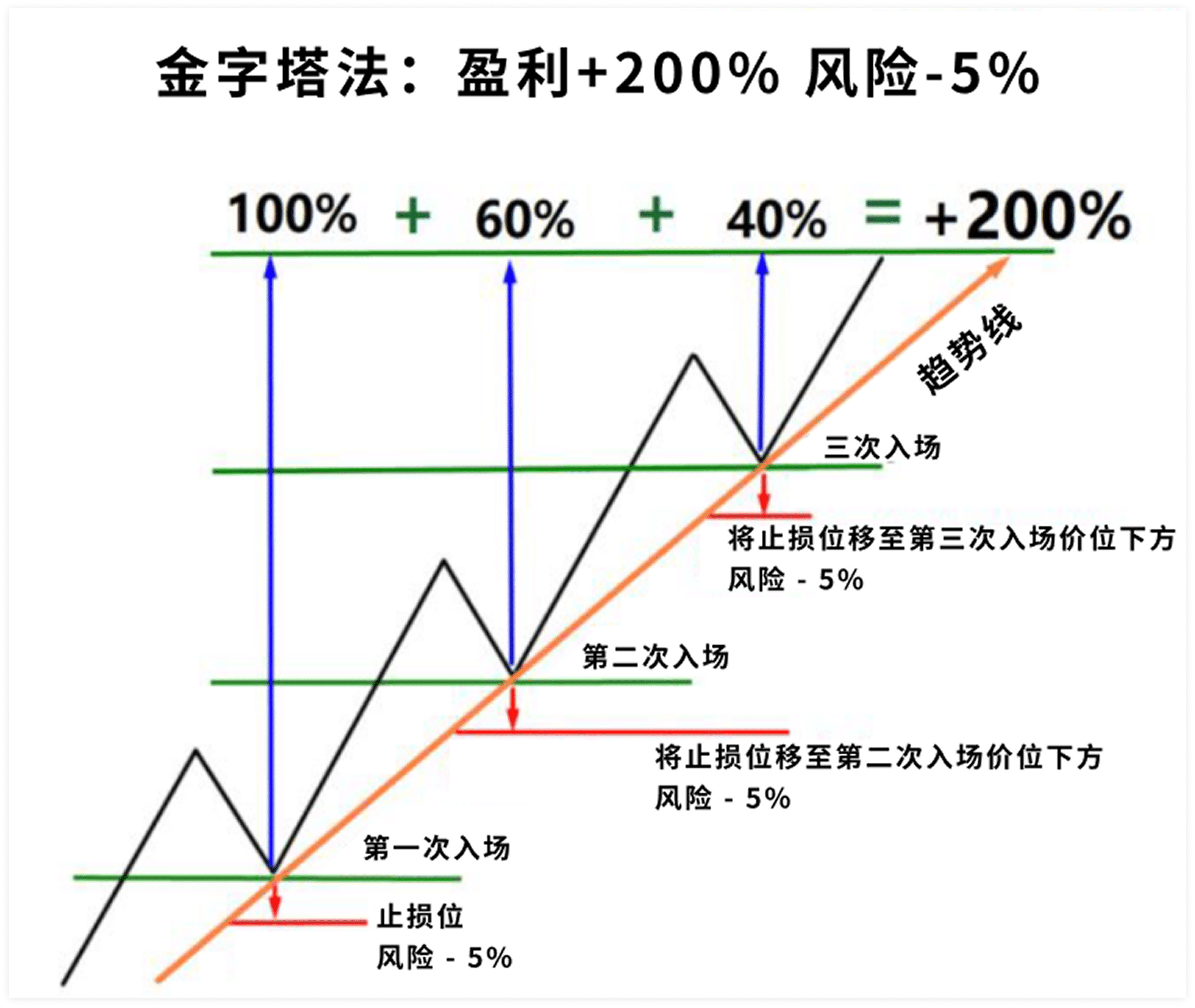 金字塔资金管理法:详细讲解如何在趋势中通过分批加仓、移动止损,实现“风险最小化、利润最大化”,并配有具体数字推演和实战图表示例。